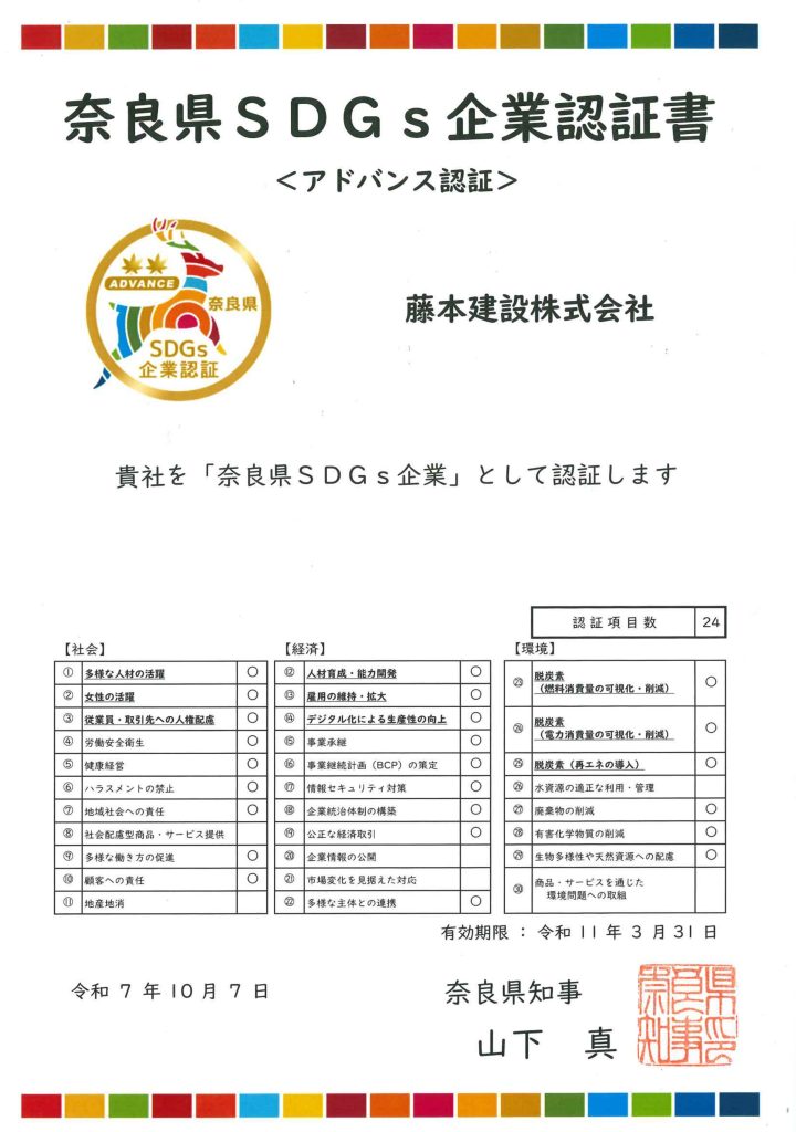 令和7年度「奈良県SDGs企業認証制度」アドバンス認定を取得しました。